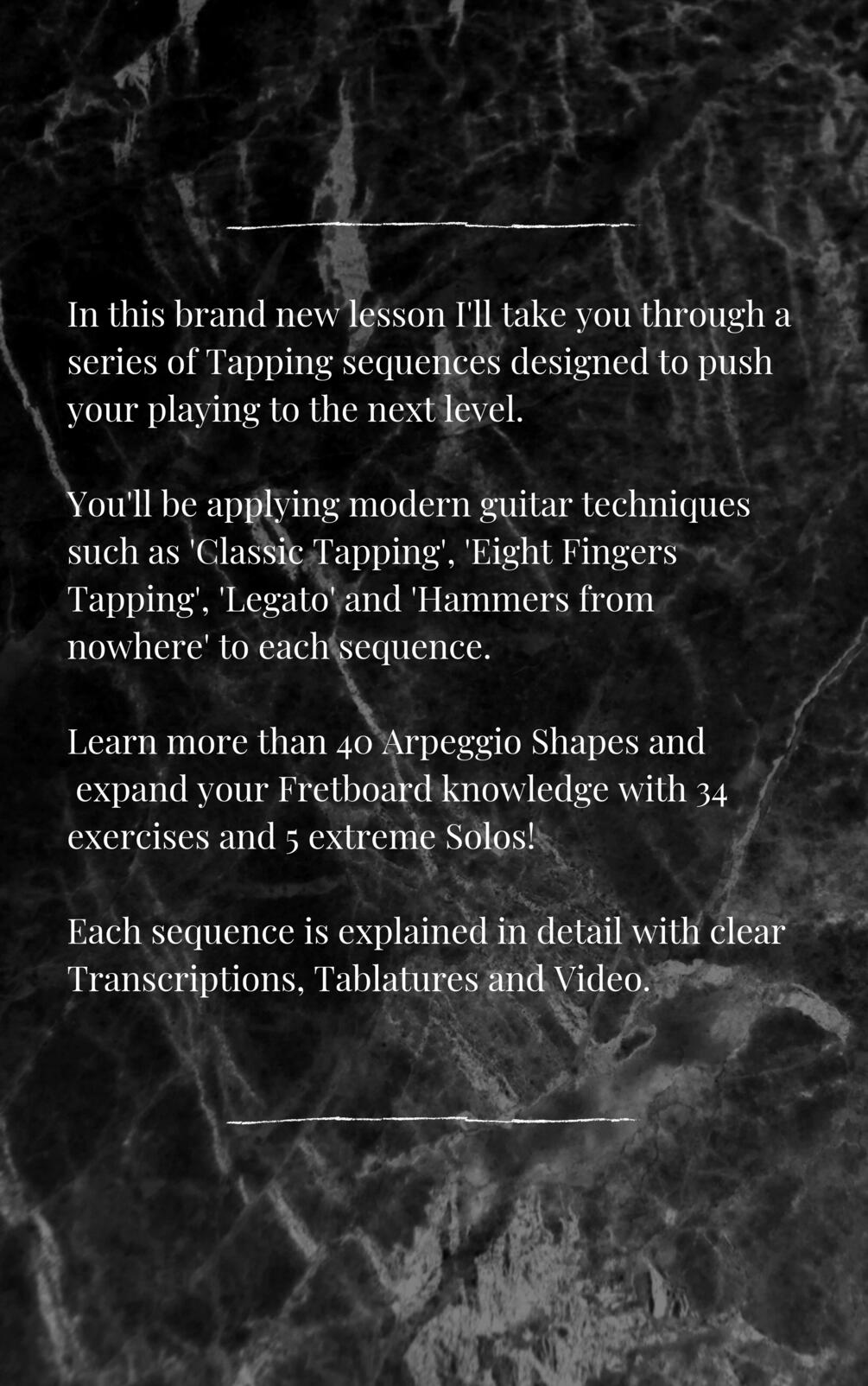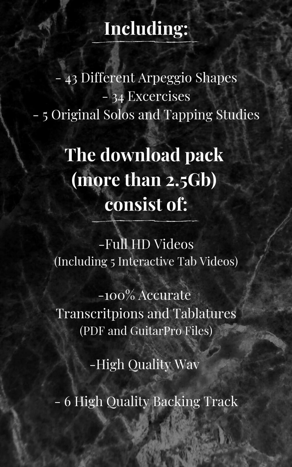 Including: 43 different Arpeggio Shapes, 34 Exercises, 5 Original Solos and Tapping Studies. The Download Pack consist of: Full HD Videos, 100% Accurate Transcription and Tablatures (PDF and GuitarPro Files), High Quality Wav, 6 High Quality Backing Track.